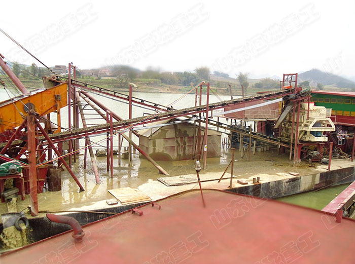挖沙选铁船由浮体、链斗挖沙系统、筛分系统、磁选系统、尾沙排除系统、动力系统组成。首先,河道里有水,麻豆免费在线观看的选矿设备必须要浮在水面上工作,因此麻豆免费在线观看用3.5-4毫米的钢板做成了浮体,根据挖沙深度的不同,浮体的宽度和长度都有相应的尺寸要求,一般宽度在1.5-2米之间,长度在16-32米之间。另外,增加船的稳定性,两个浮体之间间隔了一定的距离,一般为1.5米左右。顾名思义,这套选矿设备的上料系统是链斗式的挖沙系统,河沙由链斗提上来以后,因为有大小不一的石子,为了保护磁选机的安全,必须经过筛分系统。根据河道的环境不同,一般来说,石子比较少、直径比较小的河道用自震式比较好,维修方便,节省动力(约5KW)。