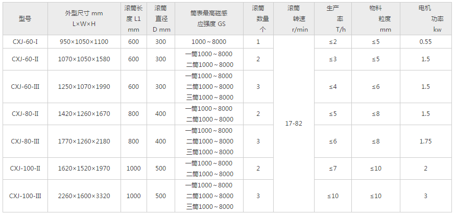 CXJ型筒式国产在线麻豆视频(从单筒到三筒)是一种从干性粉料中连续自动除铁的磁选设备其内部采用独特的磁路设计,由高性能永磁王钕铁硼材料作为磁源,磁场强、吸力大、除铁率高,入料方式采用我公司匀速振动给料装置,入料均匀,更利于进入磁选区后的分离。具有免维护、节约能源、使用可靠等特点,可调整控制进料量,适用于不同颗粒的要求。