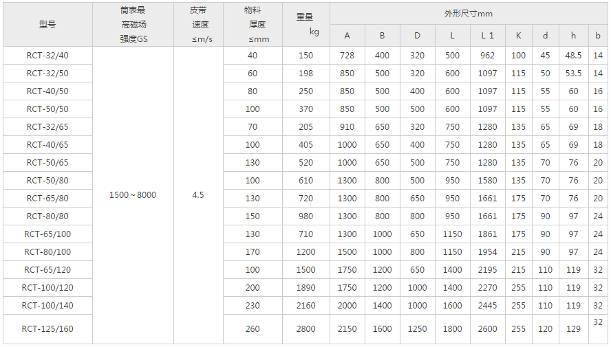 RCT型全磁滚筒与RCTG系列等同,亦称磁滑轮或干式大块磁选机。其内部采用高性能强磁材料组成强力磁系,具有磁场强度高、大、结构简单、使用方便、不需要维修、不消耗电力,常年使用退磁率小等特点。可用于水泥、磁选、矿山、钢铁、化工、耐火材料、垃圾处理等行业的选铁。